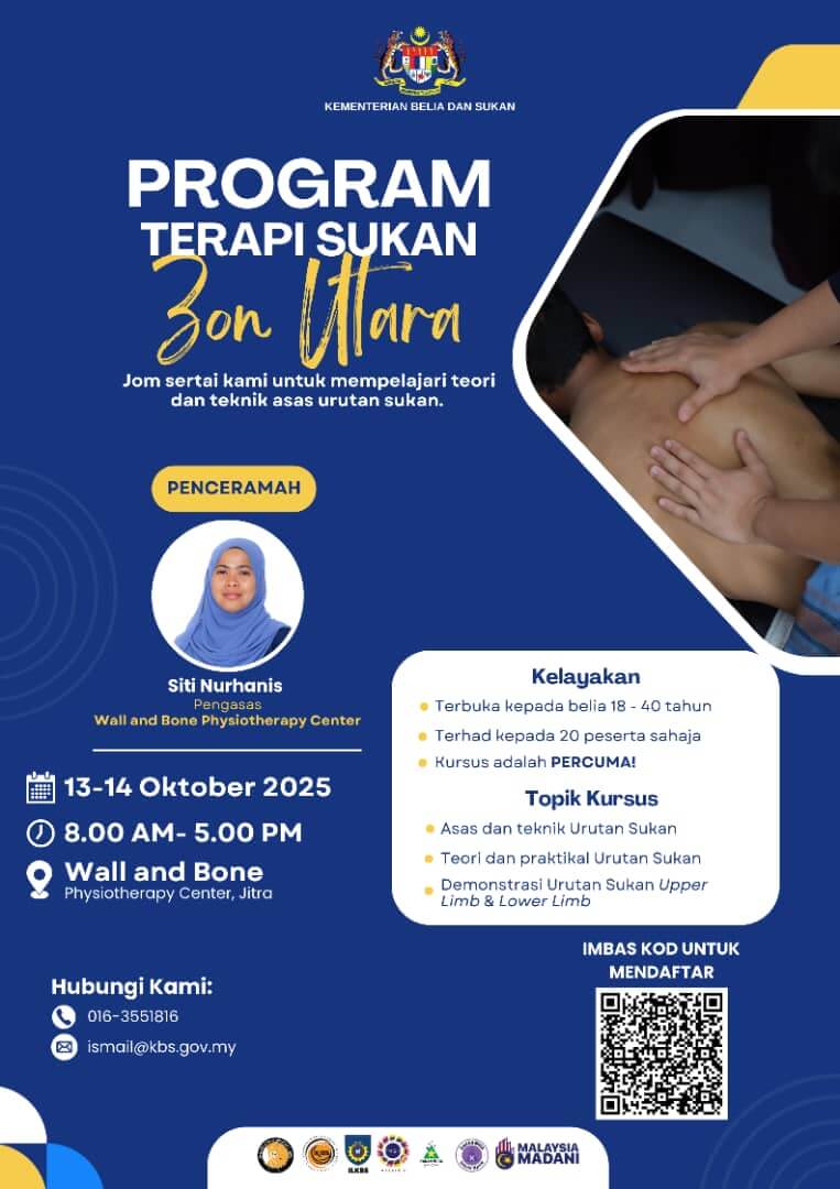 Kementerian Belia dan Sukan menjemput belia untuk menyertai Program Terapi Sukan Zon Utara, satu kursus percuma yang memberi peluang kepada peserta mempelajari asas serta teknik urutan sukan. Program ini juga akan merangkumi teori, praktikal, dan demonstrasi urutan bagi anggota atas (upper limb) dan anggota bawah (lower limb).